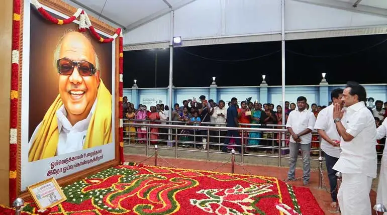 இந்நிலையில், மறைந்த முன்னாள் திமுக தலைவரும், முன்னாள் தமிழக முதலமைச்சருமான மு.கருணாநிதி அவர்களின் சமாதியில் இன்று மலர்களால் தேர்தல் சம்பந்தமான வாக்கியங்கள் கொண்டு அலங்கரிக்கப்பட்டுள்ளது.