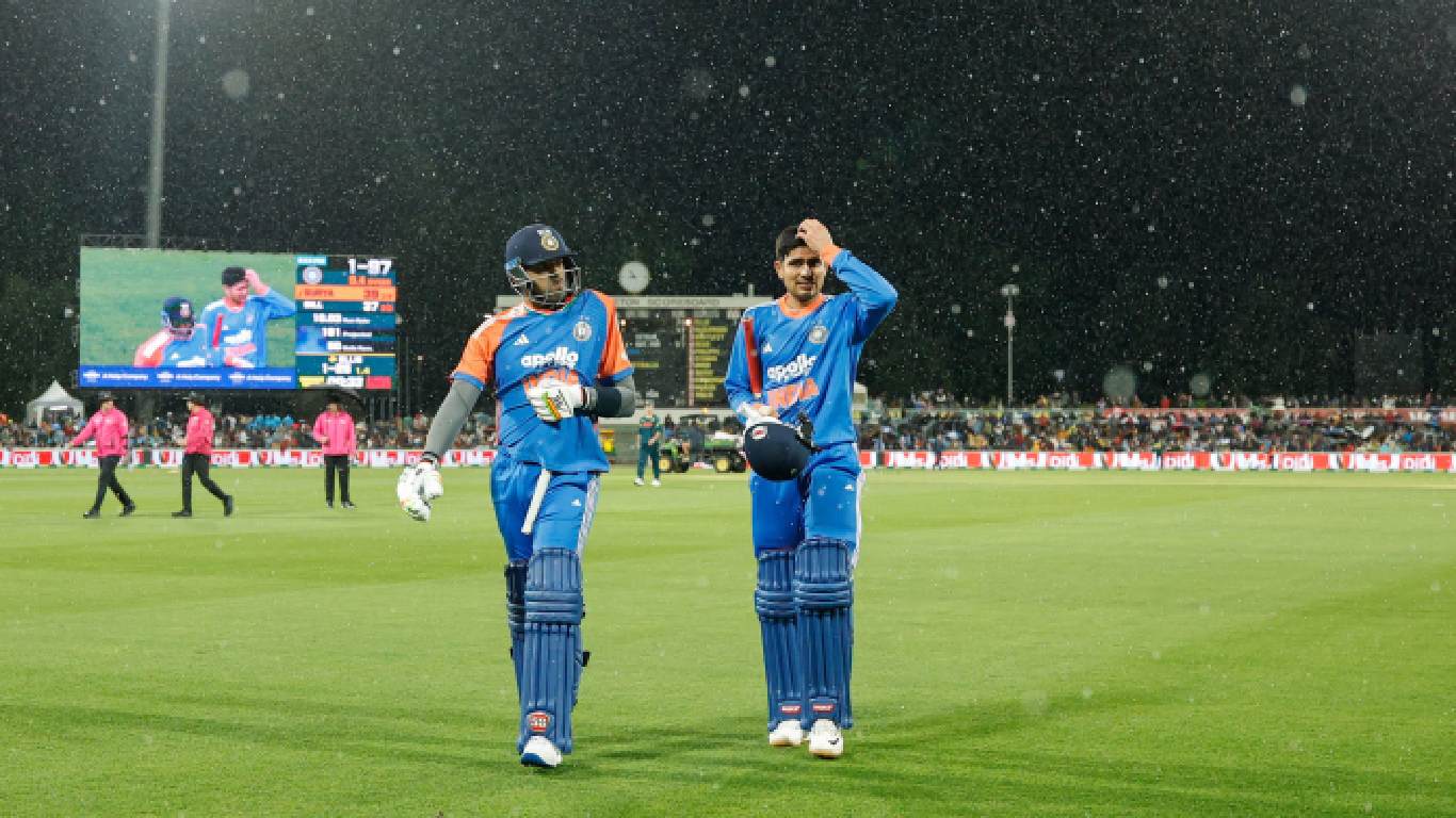 இந்திய அணி 9.4 ஓவர்களில் 1 விக்கெட் இழப்புக்கு 97 ரன்கள் எடுத்திருந்த நிலையில், திடீரென மழை பெய்யத் தொடங்கியது. மழை விடாமல் பெய்த காரணத்தினால், நீண்ட நேர காத்திருப்புக்குப் பிறகு நடுவர்கள் போட்டியை அதிகாரப்பூர்வமாக ரத்து செய்வதாக அறிவித்தனர்.